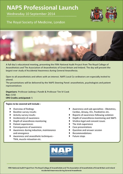 The results of the NAP5 project on Accidental Awareness during General Anaesthesia will be presented at the Professional Launch on Wednesday 10th September 2014 at the Royal Society of Medicine. NAP5 will kindly support the registration fee for Local Coordinators in recognition of their contribution to the project, providing their Trust is unable to reimburse them. For more information and to register, please click here.